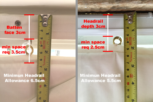 The traditional wooden batten on the left has a face depth of 3cm and the minimum distance needed below the blind is 3.5cm. Note if you are using larger eyelets you may need more than 3.5cm below the batten. That gives an absolute minimum headrail allowance of 6.5cm.