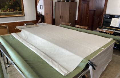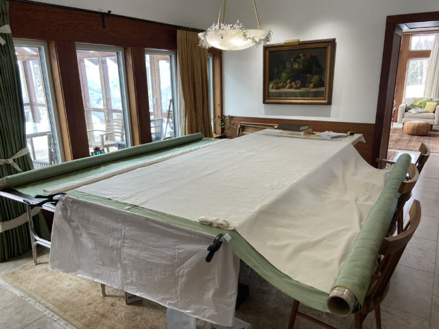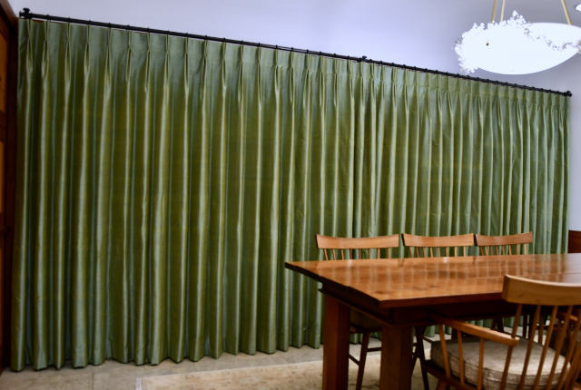 Curtains made by Carol. She said "I would like to finally thank you for guiding me through perhaps the most daunting sewing project I have ever undertaken. This past snowy February I made 15.5 ft long 83" tall double pleated interlined curtains in a dupioni silk, and I could never have done it without you! Your calm and reassuring instructions and videos gave clear and concise direction with just the right amount of detail." "My layout table consisted of a full sheet of plywood over the dining table, with 2 "wing" tables to accommodate 2 8ft tall cardboard tubes for fabric. There was barely room for my sewing machine. It was a lot of heavy work, as you well know, but I really enjoyed the whole process. I thought I knew hand stitching (my German grandmother was a seamstress) but I learned a lot from you! And the curtains came out weighty and beautiful, with a lovely drape and not a stitch in sight. Photos attached."" "Thanks for your fabulous tutorial!""